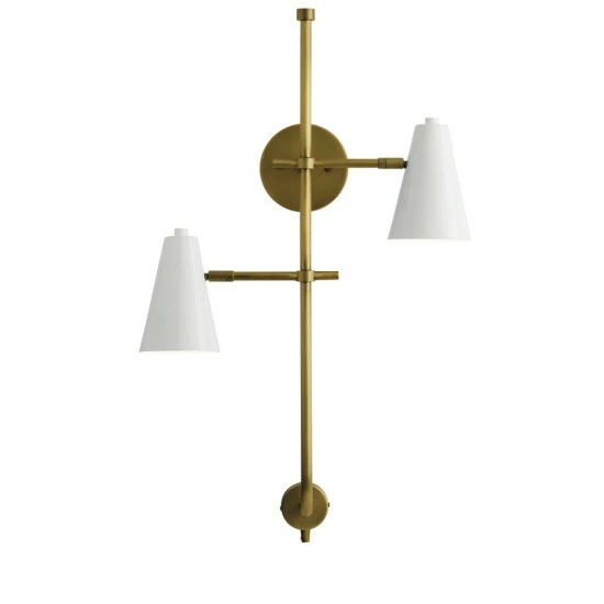 The Sylvia 2 light wall sconce makes a big impression in a soft voice. Each shade is White, (inside and out), has an on/off switch, and can swivel to direct light where you want. Straight arms extend away from pole in a Natural Brass finish, giving the entire fixture a luxurious feel. This luxe mid-century modern fixture is unique and exciting without being bold or brash.Sylvia wall sconce brings a quiet individuality to your space. Each shade can swivel, and each features individual on/off switches. You can choose to install the sconce by pinning and plugging it into the wall, or you can hardware it.