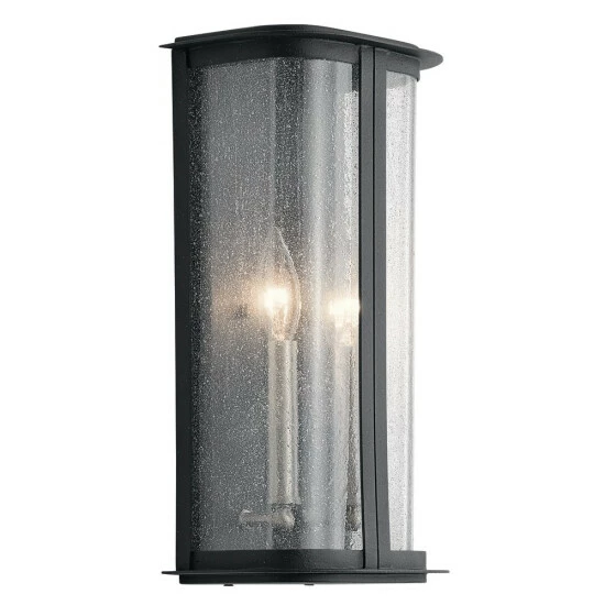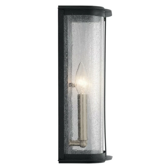 Instantly add sophistication with the Timmin 14 inch 1 light wall light. Its curved shape and elegant Distressed Black finish make it unique, while its Clear Seeded Glass adds texture and dimension. As the light shines through, the bulbs you choose play a role in this stylish display.The Timmin collection works in a variety of design styles including updated transitional.Design inspiration is all around us. The Timmin wall light is a perfect example, owing its unique shape to a contemporary bureau. Its smooth, curved look instantly adds sophistication to your home’s refined exterior.Clear Seeded Glass is glass that’s textured to create a unique look. It ever-so-delicately softens the light but still emits a welcoming glow. It also helps hid fingerprints and other elements that often make exterior lights hard to keep clean, which is always a welcome benefit.