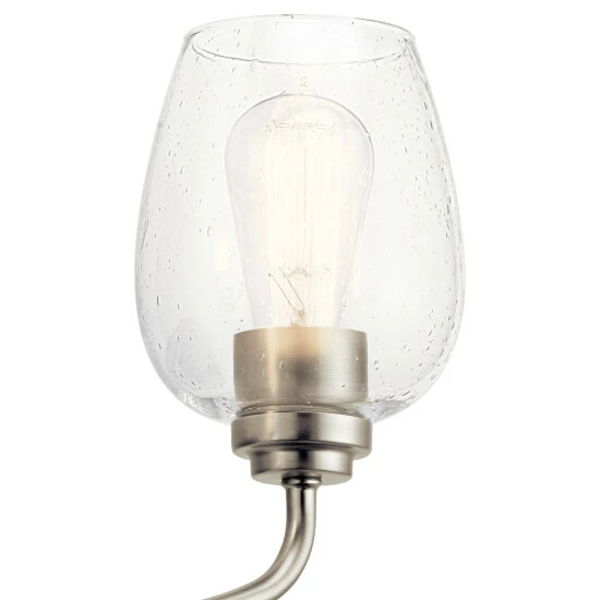 The Valserrano 24 inch 3 light vanity light features wine goblet shaped clear seeded glass shades with a clean design in Brushed Nickel finish. A perfect addition in several aesthetic environments including transitional, traditional or farmhouse decor. Offers a classic design that works well with transitional, traditional or farmhouse dΓ©cor. The Valserrano 3 light vanity light features clear seeded glass and Brushed Nickel finish. Mount up or down, this transitional style vanity fits perfectly with a variety of bathroom and powder room styles and uses a 75 watt (max.) bulb or equivalent LED bulb.