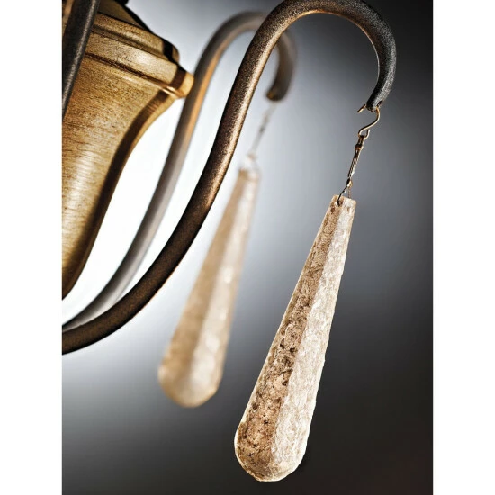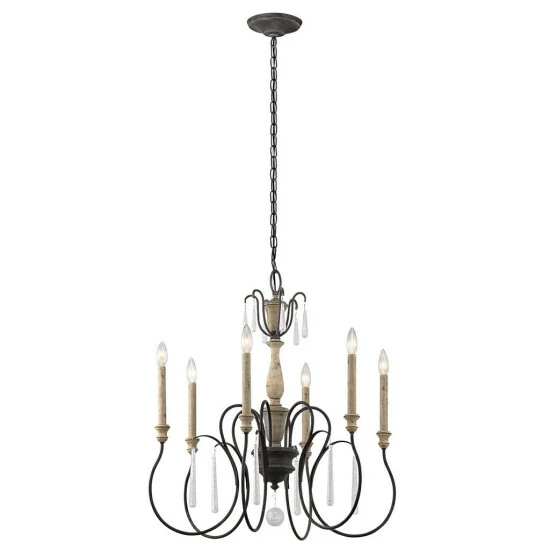 This Kimblewick collection 6-light chandelier features a weathered zinc finish that will complement many transitional decors. Long swooping arms add interest while hanging glass accents will add a touch of class and elegance to any space. Kimblewick is inspired by the French country style and farmhouse simplicity. Throughout the entire chandelier different textures are used, including a weathered zinc metal framework and a distressed antique white center column. But the true showstoppers are the parchment glass teardrops: they feature the translucency of glass with the rustic appearance of wrinkled parchment paper. This piece includes 72 inches of chain and 54 inches wire so it can be hung at your desired height (Up to 102 inches). Dimensions: 27.75 inches high x 26 inch diameter. Turn on our fixtures, and watch your room transform even more. From lighting to ceiling fans Kichler collections are built around our simple philosophy of bringing you the effect you want for your home or business. Our collections coordinate from room-to-room, or let you mix and match from wall-to-ceiling. And each fixture is designed to deliver a stunning quality of light that makes your space more beautiful and more livable. As one of the largest, privately held residential lighting fixture companies in North America, we’re constantly working to create innovative and on-trend decorative products as well as knowledgeable support. Since 1938, we’ve been creating products that are not only well designed, but also practical. We invest millions of dollars each year in design, technology and testing to assure that we’re offering distributors, designers, installers and homeowners not only innovative technologies – but also fixtures that perform efficiently, install intuitively and deliver a premium source of light. This philosophy holds true for everything we create – from our wide variety of decorative fixtures to our award-winning landscape lighting to our ceiling fans.