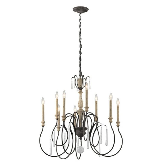 This Kimblewick collection 9-light chandelier features a weathered zinc finish that will complement many transitional decors. Long swooping arms add interest while hanging glass accents will add a touch of class and elegance to any space. Kimblewick is inspired by the French country style and farmhouse simplicity. Throughout the entire chandelier different textures are used, including a weathered zinc metal framework and a distressed antique white center column. But the true showstoppers are the parchment glass teardrops: they feature the translucency of glass with the rustic appearance of wrinkled parchment paper. This piece includes 72 inches of chain and 51 inches wire so it can be hung at your desired height (Up to 107 inches). Dimensions: 32.25 inches high x 30 inch diameter. Turn on our fixtures, and watch your room transform even more. From lighting to ceiling fans Kichler collections are built around our simple philosophy of bringing you the effect you want for your home or business. Our collections coordinate from room-to-room, or let you mix and match from wall-to-ceiling. And each fixture is designed to deliver a stunning quality of light that makes your space more beautiful and more livable. As one of the largest, privately held residential lighting fixture companies in North America, we’re constantly working to create innovative and on-trend decorative products as well as knowledgeable support. Since 1938, we’ve been creating products that are not only well designed, but also practical. We invest millions of dollars each year in design, technology and testing to assure that we’re offering distributors, designers, installers and homeowners not only innovative technologies – but also fixtures that perform efficiently, install intuitively and deliver a premium source of light. This philosophy holds true for everything we create – from our wide variety of decorative fixtures to our award-winning landscape lighting to our ceiling fans.