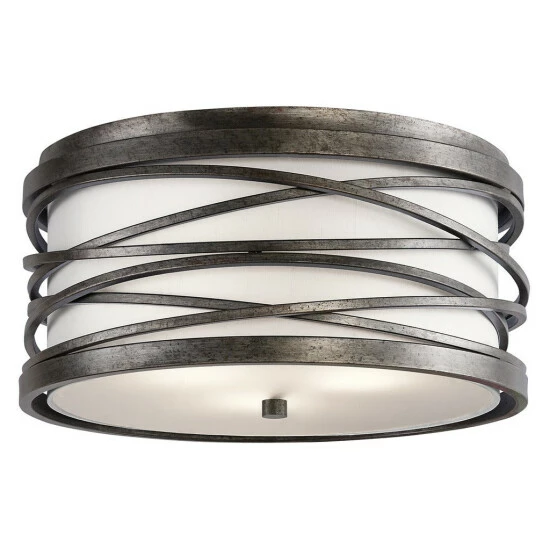 This Krasi collection 3-light flush mount features a warm bronze finish that will complement many transitional decors. Strong, clean lines of the steel frame add interest while the etched tempered glass and white fabric shade softens the light. This distinctive Krasi collection combines strong lines with delicate detailing to create an impact in your home. Featuring clear etched tempered glass, an off white fabric shade, and a warm bronze finish, this design will accent any space. Dimensions: 7.75 inches high x 16 inch diameter. Turn on our fixtures, and watch your room transform even more. From lighting to ceiling fans Kichler collections are built around our simple philosophy of bringing you the effect you want for your home or business. Our collections coordinate from room-to-room, or let you mix and match from wall-to-ceiling. And each fixture is designed to deliver a stunning quality of light that makes your space more beautiful and more livable. As one of the largest, privately held residential lighting fixture companies in North America, we’re constantly working to create innovative and on-trend decorative products as well as knowledgeable support. Since 1938, we’ve been creating products that are not only well designed, but also practical. We invest millions of dollars each year in design, technology and testing to assure that we’re offering distributors, designers, installers and homeowners not only innovative technologies – but also fixtures that perform efficiently, install intuitively and deliver a premium source of light. This philosophy holds true for everything we create – from our wide variety of decorative fixtures to our award-winning landscape lighting to our ceiling fans.
