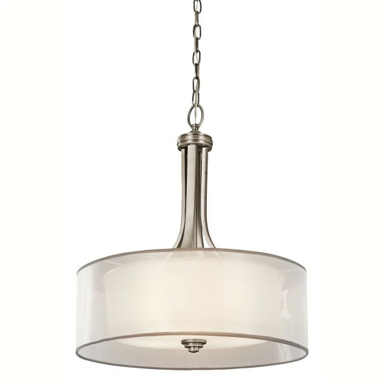 This 4-light pendant from the Lacey collection features an antique pewter finish that will complement many transitional decors. The double shades made up of decorative mesh and satin etched white glass will add interest to any space. The Lacey collection offers a beautiful contrast, melding the charm of olde world style with clean modern-day materials. It starts with our antique pewter finish and bold, unadorned rounded-arm styling. It finishes with avant-garde double shades made of decorative mesh screens and opal inner glass. This piece includes 35 inches of lead wire and 72 inches of chain so it can be hung at your desired height. Dimensions: 23.5 inches high x 20 inch diameter. Turn on our fixtures, and watch your room transform even more. From lighting to ceiling fans Kichler collections are built around our simple philosophy of bringing you the effect you want for your home or business. Our collections coordinate from room-to-room, or let you mix and match from wall-to-ceiling. And each fixture is designed to deliver a stunning quality of light that makes your space more beautiful and more livable.As one of the largest, privately held residential lighting fixture companies in North America, we’re constantly working to create innovative and on-trend decorative products as well as knowledgeable support. Since 1938, we’ve been creating products that are not only well designed, but also practical. We invest millions of dollars each year in design, technology and testing to assure that we’re offering distributors, designers, installers and homeowners not only innovative technologies – but also fixtures that perform efficiently, install intuitively and deliver a premium source of light. This philosophy holds true for everything we create – from our wide variety of decorative fixtures to our award-winning landscape lighting to our ceiling fans.