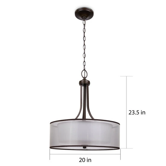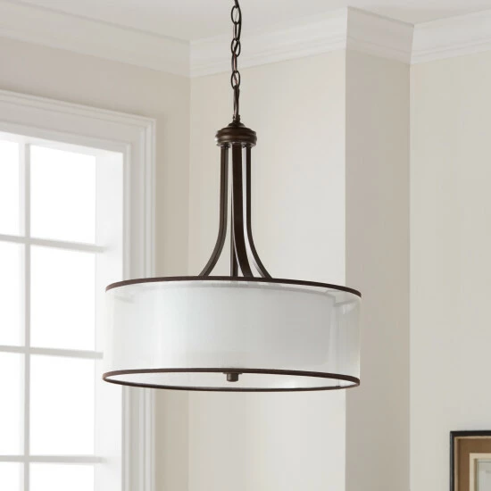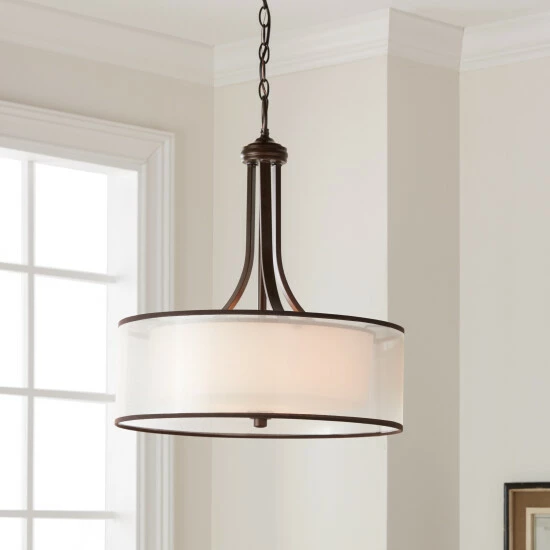 This 4-light pendant from the Lacey collection features a mission bronze finish that will complement many transitional decors. The double shades made up of decorative mesh and satin etched white glass will add interest to any space. The Lacey collection offers a beautiful contrast, melding the charm of olde world style with clean modern-day materials. It starts with our new mission bronze finish and bold, unadorned rounded-arm styling. It finishes with avant-garde double shades made of decorative mesh screens and opal inner glass. This piece includes 35 inches of lead wire and 72 inches of chain so it can be hung at your desired height. Dimensions: 23.5 inches high x 20 inch diameter. Turn on our fixtures, and watch your room transform even more. From lighting to ceiling fans Kichler collections are built around our simple philosophy of bringing you the effect you want for your home or business. Our collections coordinate from room-to-room, or let you mix and match from wall-to-ceiling. And each fixture is designed to deliver a stunning quality of light that makes your space more beautiful and more livable.As one of the largest, privately held residential lighting fixture companies in North America, we’re constantly working to create innovative and on-trend decorative products as well as knowledgeable support. Since 1938, we’ve been creating products that are not only well designed, but also practical. We invest millions of dollars each year in design, technology and testing to assure that we’re offering distributors, designers, installers and homeowners not only innovative technologies – but also fixtures that perform efficiently, install intuitively and deliver a premium source of light. This philosophy holds true for everything we create – from our wide variety of decorative fixtures to our award-winning landscape lighting to our ceiling fans.