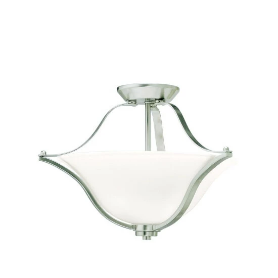 This Langford collection 2-light convertible inverted pendant/semi-flush mount features a brushed nickel finish that will complement many transitional decors. Clean lines of the steel frame add interest while etched glass bowl softens the light to create an inviting atmosphere. With clean, flowing lines that embrace simple and graceful contemporary style, the Langford collection is perfect for the homeowner looking for a new interpretation of classic design. The brushed nickel finish accentuates the Langford design with crisp appeal, allowing it to work with almost any decor. Langford fixtures provide a fresh ambiance to a room with the assistance of etched white glass, providing an earthy comfort that blends well with more traditional interiors. All necessary hardware to convert this piece to a semi-flush mount is included. This piece includes 36 inches of chain and 8 inches of wire so it can be hung at your desired height (Up to 52 inches). Dimensions: 13.25 inches high x 18.75 inch diameter. Turn on our fixtures, and watch your room transform even more. From lighting to ceiling fans Kichler collections are built around our simple philosophy of bringing you the effect you want for your home or business. Our collections coordinate from room-to-room, or let you mix and match from wall-to-ceiling. And each fixture is designed to deliver a stunning quality of light that makes your space more beautiful and more livable. As one of the largest, privately held residential lighting fixture companies in North America, we’re constantly working to create innovative and on-trend decorative products as well as knowledgeable support. Since 1938, we’ve been creating products that are not only well designed, but also practical. We invest millions of dollars each year in design, technology and testing to assure that we’re offering distributors, designers, installers and homeowners not only innovative technologies – but also fixtures that perform efficiently, install intuitively and deliver a premium source of light. This philosophy holds true for everything we create – from our wide variety of decorative fixtures to our award-winning landscape lighting to our ceiling fans.