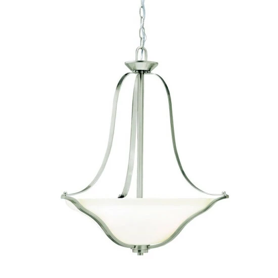 This Langford collection 3-light inverted pendant features a brushed nickel finish that will complement many transitional decors. The etched glass shade softens the light creating a warm ambiance completing this simple yet functional design. With clean, flowing lines that embrace simple and graceful contemporary style, the Langford collection is perfect for the homeowner looking for a new interpretation of classic design. The brushed nickel finish accentuates the Langford design with crisp appeal, allowing it to work with almost any decor. Langford fixtures provide a fresh ambiance to a room with the assistance of etched white glass, providing an earthy comfort that blends well with more traditional interiors. This piece includes 72 inches of chain and 20 inches of wire so it can be hung at your desired height (up to 100 inches). Dimensions: 25.5 inches high x 22 inch diameter.