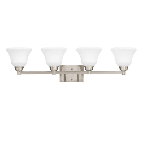 This 4-light bath/vanity fixture from the Langford collection features a brushed nickel finish that will complement many transitional decors. The satin etched white glass shades soften the light to create a warm ambiance for any space. With clean, flowing lines that embrace simple and graceful contemporary style, the Langford collection is perfect for the homeowner looking for a new interpretation of classic design. The brushed nickel finish accentuates the Langford design with crisp appeal, allowing it to work with almost any decor. Langford fixtures provide a fresh ambiance to a room with the assistance of etched white glass, providing an earthy comfort that blends well with more traditional interiors. The glass can be installed either up or down. Dimensions: 8.5 inches high x 35 inches wide x 8.25 inches deep. Turn on our fixtures, and watch your room transform even more. From lighting to ceiling fans Kichler collections are built around our simple philosophy of bringing you the effect you want for your home or business. Our collections coordinate from room-to-room, or let you mix and match from wall-to-ceiling. And each fixture is designed to deliver a stunning quality of light that makes your space more beautiful and more livable. As one of the largest, privately held residential lighting fixture companies in North America, we’re constantly working to create innovative and on-trend decorative products as well as knowledgeable support. Since 1938, we’ve been creating products that are not only well designed, but also practical. We invest millions of dollars each year in design, technology and testing to assure that we’re offering distributors, designers, installers and homeowners not only innovative technologies – but also fixtures that perform efficiently, install intuitively and deliver a premium source of light. This philosophy holds true for everything we create – from our wide variety of decorative fixtures to our award-winning landscape lighting to our ceiling fans.