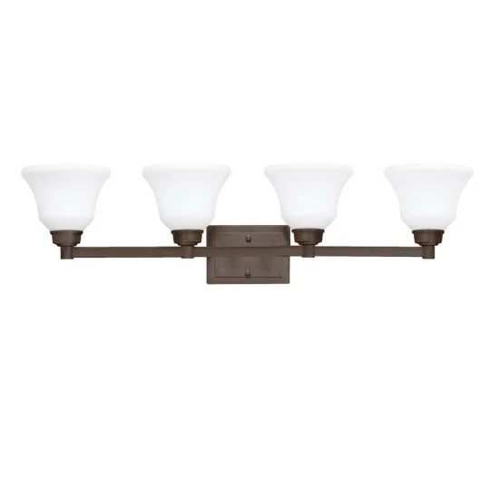This Langford collection 4-light bath/vanity light features an olde bronze finish that will complement many transitional decors. Clean lines of the steel frame add interest while satin etched glass shades soften the light to create a warm ambiance. This classic wall fixture from the Langford(TM) collection is a timeless accent fitting for any space. The olde bronze finish and satin etched glass combine to create a refined statement. Dimensions: 8.5 inches high x 35 inches wide x 8.25 inches deep.