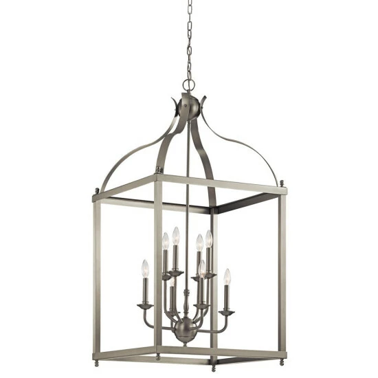 This Larkin collection 8-light chandelier features a brushed nickel finish that will complement many traditional decors. The clean lines of the steel frame form a cage around the light cluster and will add interest to any space. This piece includes 72 inches of chain and 34 inches of wire so it can be hung at your desired height (Up to 122 inches). Dimensions: 47.75 inches high x 24 inch diameter. Turn on our fixtures, and watch your room transform even more. From lighting to ceiling fans Kichler collections are built around our simple philosophy of bringing you the effect you want for your home or business. Our collections coordinate from room-to-room, or let you mix and match from wall-to-ceiling. And each fixture is designed to deliver a stunning quality of light that makes your space more beautiful and more livable. As one of the largest, privately held residential lighting fixture companies in North America, we’re constantly working to create innovative and on-trend decorative products as well as knowledgeable support. Since 1938, we’ve been creating products that are not only well designed, but also practical. We invest millions of dollars each year in design, technology and testing to assure that we’re offering distributors, designers, installers and homeowners not only innovative technologies – but also fixtures that perform efficiently, install intuitively and deliver a premium source of light. This philosophy holds true for everything we create – from our wide variety of decorative fixtures to our award-winning landscape lighting to our ceiling fans.