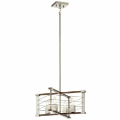 Inspired by the cable railings found in industrial settings, The Lente 4 light pendant makes a bold statement. The light Auburn wood-look and Brushed Nickel finish combination adds depth and dimension.