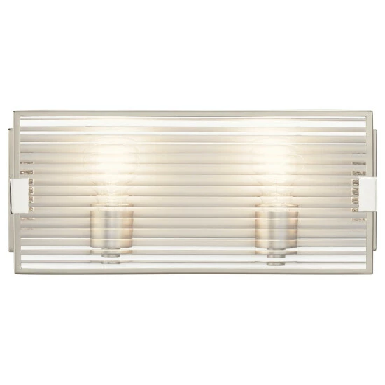 Sleek and modern, the Logan collection’s standout feature is its solid sheet of fluted glass. Behind it, the light shines through, adding interest to the texture and filling a bath with necessary illumination. In front, the glass is finished with a nickel frame for a polished look.