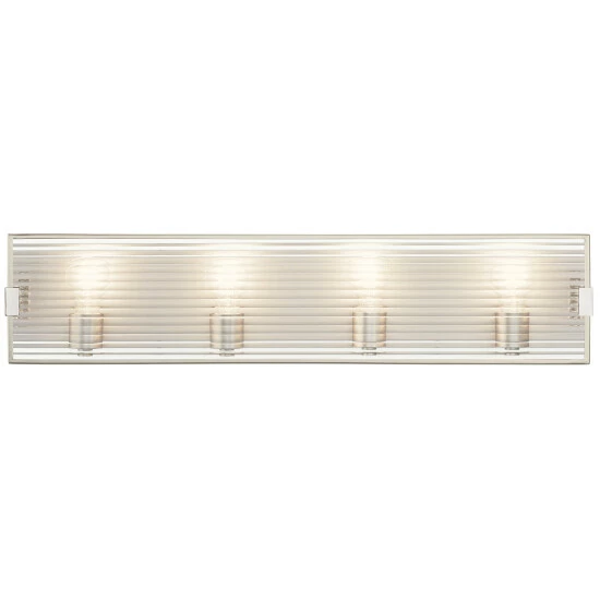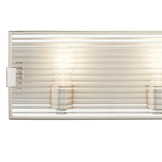 Sleek and modern, the Logan collection’s standout feature is its solid sheet of fluted glass. Behind it, the light shines through, adding interest to the texture and filling a bath with necessary illumination. In front, the glass is finished with a nickel frame for a polished look.