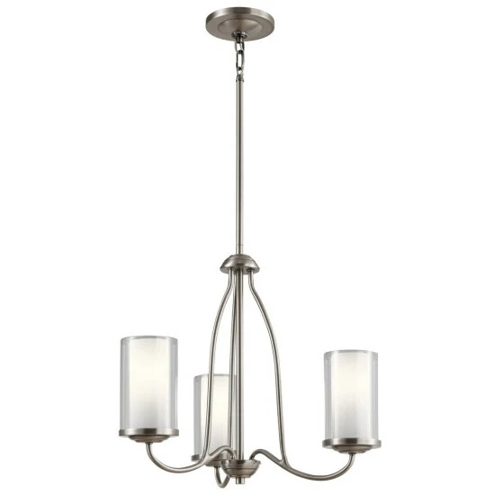 This Lorin collection 3-light chandelier features a classic pewter finish that will complement many transitional decors. The clean lines of the steel frame add interest while the combination of the clear and etched glass shades soften the light providing a warm atmosphere for many spaces.
