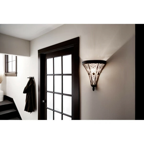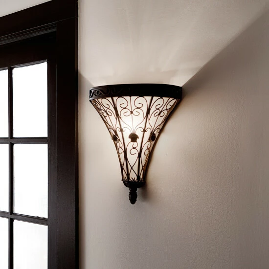 This 1-light wall sconce from the Marchesa collection features a terrene bronze finish that will complement many traditional decors. The intricate detail of the steel frame adds interest while the piastra glass provides a beautiful tint to the light. The Marchesa collection features European inspired silhouettes cast in a soft terrene bronze finish. The ornamental basket design is intricately detailed with swirling textures and botanical accents. Dimensions: 15 inches high x 12.75 inches wide x 6.75 inches deep. Turn on our fixtures, and watch your room transform even more. From lighting to ceiling fans Kichler collections are built around our simple philosophy of bringing you the effect you want for your home or business. Our collections coordinate from room-to-room, or let you mix and match from wall-to-ceiling. And each fixture is designed to deliver a stunning quality of light that makes your space more beautiful and more livable. As one of the largest, privately held residential lighting fixture companies in North America, we’re constantly working to create innovative and on-trend decorative products as well as knowledgeable support. Since 1938, we’ve been creating products that are not only well designed, but also practical. We invest millions of dollars each year in design, technology and testing to assure that we’re offering distributors, designers, installers and homeowners not only innovative technologies – but also fixtures that perform efficiently, install intuitively and deliver a premium source of light. This philosophy holds true for everything we create – from our wide variety of decorative fixtures to our award-winning landscape lighting to our ceiling fans.