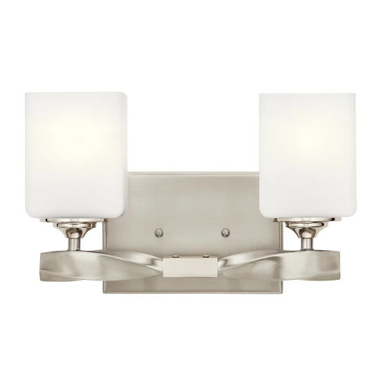 The Marette 13.5″ 2 light vanity light with satin etched cased opal glass and twisted arm in Brushed Nickel finish. A perfect addition in several aesthetic environments, including traditional, transitional and modern. The Marette 2 light vanity light with satin etched cased opal glass and twisted Brushed Nickel finish arms uses 75 watt (max.) bulb equivalent, measures 13.5″ in width with a body height of 7.75″.