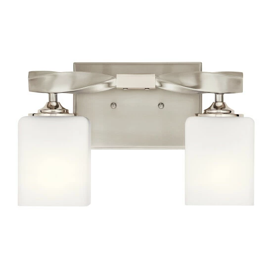 - 13.5″, two light vanity light with satin etched cased opal glass in Brushed Nickel finish.