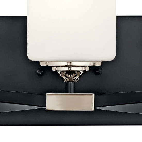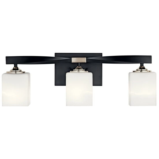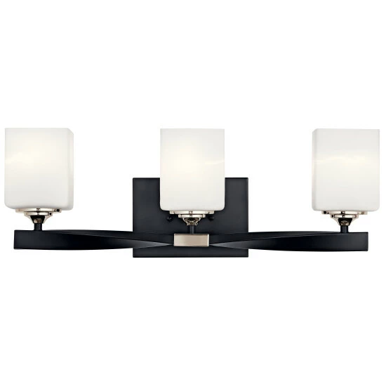 The Marette 22.75″ 3 light vanity light with satin etched cased opal glass and twisted arm in Black finish. A perfect addition in several aesthetic environments, including traditional, transitional and modern. The Marette 3 light vanity light with satin etched cased opal glass and twisted Black finish arm uses 75 watt (max.) bulb equivalent, measures 22.75″ in width with a body height of 8″.