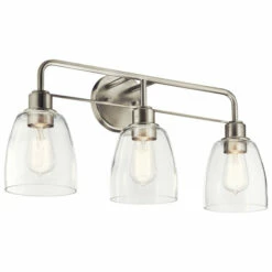 - The Meller 24.25 inch 3 light vanity light features a round backplate and curved arms finished in Brushed Nickel; clear Glass shades put the vintage bulbs on display