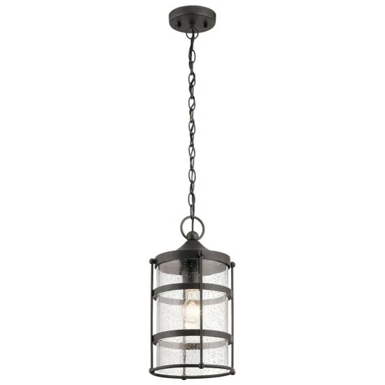 This Mill Lane collection 1-light outdoor pendant features a beautifully hand painted anvil iron finish that will complement many transitional decors. Clean lines of the aluminum frame add interest while the clear seeded glass gives a unique look to the light giving your outdoor decor a whole new look.