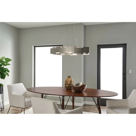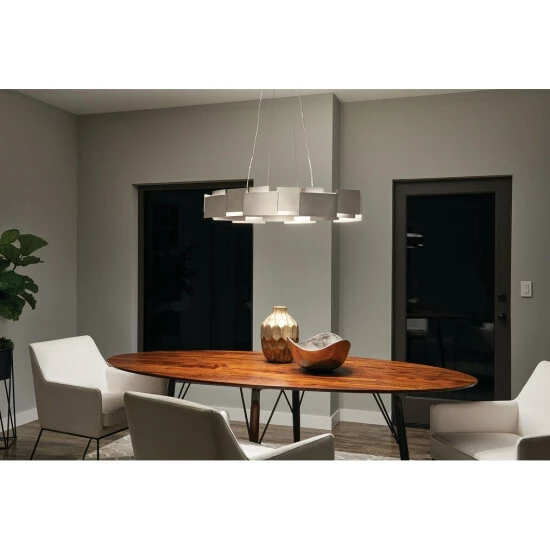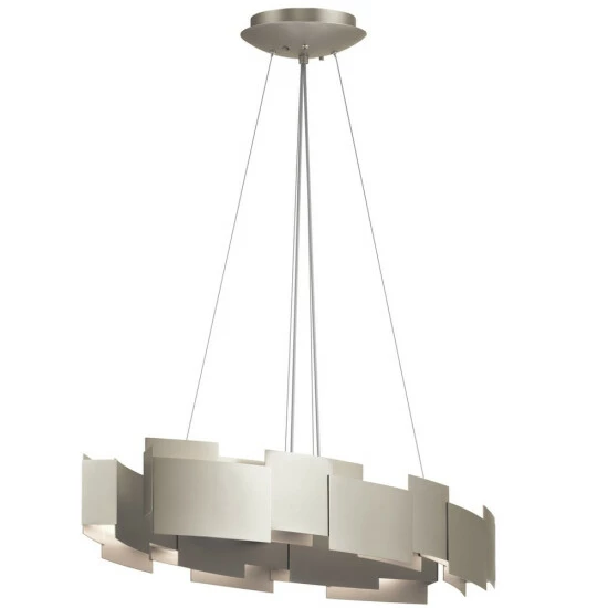 This Moderne collection 2-light LED oval chandelier/pendant features a satin nickel finish that will complement many contemporary and modern decors. The geometric pattern of the steel frame adds interest while the polycarbonate diffuser softens the light. Geometry makes this fixture from the Moderne collection simply striking. The contemporary style features a suspended cable design. Yet the defining element is the offset satin nickel square and rectangular panels, the perfect separation between the fixture’s up and down LED lighting. The 2525 delivered Lumens is equivalent to around a 150 W Incandescent bulb. This piece comes with enough hanging wire so it can be hung at your desired height (Up to 80 inches). Dimensions: 6.25 inches high x 34.25 inches wide x 16.25 inches deep. Turn on our fixtures, and watch your room transform even more. From lighting to ceiling fans Kichler collections are built around our simple philosophy of bringing you the effect you want for your home or business. Our collections coordinate from room-to-room, or let you mix and match from wall-to-ceiling. And each fixture is designed to deliver a stunning quality of light that makes your space more beautiful and more livable. As one of the largest, privately held residential lighting fixture companies in North America, were constantly working to create innovative and on-trend decorative products as well as knowledgeable support. Since 1938, weve been creating products that are not only well designed, but also practical. We invest millions of dollars each year in design, technology and testing to assure that were offering distributors, designers, installers and homeowners not only innovative technologies but also fixtures that perform efficiently, install intuitively and deliver a premium source of light. This philosophy holds true for everything we create from our wide variety of decorative fixtures to our award-winning landscape lighting to our ceiling fans.
