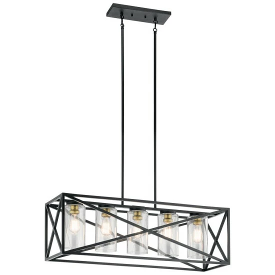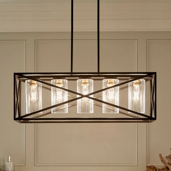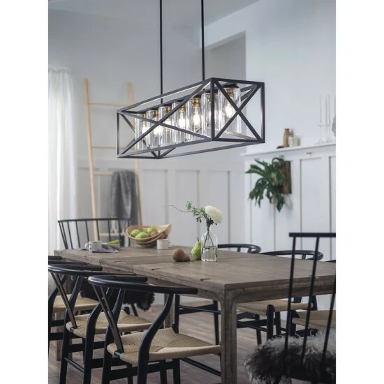 Create a striking focal point in your rustic space when you install this Moorgate chandelier by Kichler Lighting. This fixture’s black steel frame features clean lines and a geometric design that instantly captivates visitors, and the five glass shades further enhance its visual appeal while providing multidirectional lighting throughout your space.