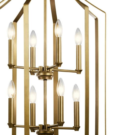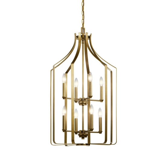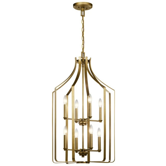 The Morrigan 8 light foyer chandelier in a Natural Brass finish highlights the beauty of candelabras with a modern twist of clean lines, an open cage structure, and curved design detail. Its traditional inspired style mixes nicely with a variety of looks.