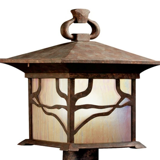 This Morris collection 1-light outdoor post lantern features a distressed copper finish that will complement many arts and crafts and mission decors. The iridescent seedy glass panels that box in the light will add a unique look to your outdoor decor. The incomparable trailing design of this post top fixture from the Morris collection reflects Southwest Mission style. Distressed copper finish along with the inside etched, iridescent-seedy glass will be admired time and again. Post not included. Dimensions: 14.75 inches high x 12 inch diameter. Turn on our fixtures, and watch your room transform even more. From lighting to ceiling fans Kichler collections are built around our simple philosophy of bringing you the effect you want for your home or business. Our collections coordinate from room-to-room, or let you mix and match from wall-to-ceiling. And each fixture is designed to deliver a stunning quality of light that makes your space more beautiful and more livable. As one of the largest, privately held residential lighting fixture companies in North America, we’re constantly working to create innovative and on-trend decorative products as well as knowledgeable support. Since 1938, we’ve been creating products that are not only well designed, but also practical. We invest millions of dollars each year in design, technology and testing to assure that we’re offering distributors, designers, installers and homeowners not only innovative technologies – but also fixtures that perform efficiently, install intuitively and deliver a premium source of light. This philosophy holds true for everything we create – from our wide variety of decorative fixtures to our award-winning landscape lighting to our ceiling fans.