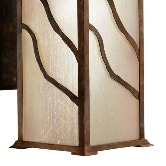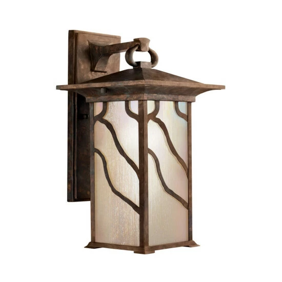 This Morris collection 1-light outdoor wall lantern features a distressed copper finish that will complement many arts and crafts, mission, and transitional style decors. The intricate detail of the cast aluminum frame adds interest and completes the look of this unique design. The incomparable trailing design of this wall lantern from the Morris collection reflects southwest mission style. Distressed copper finish along with the inside etched, iridescent-seedy glass will be admired time and again.