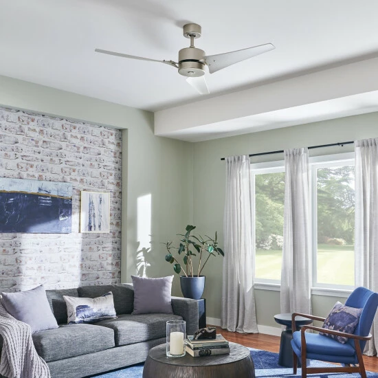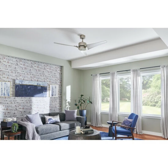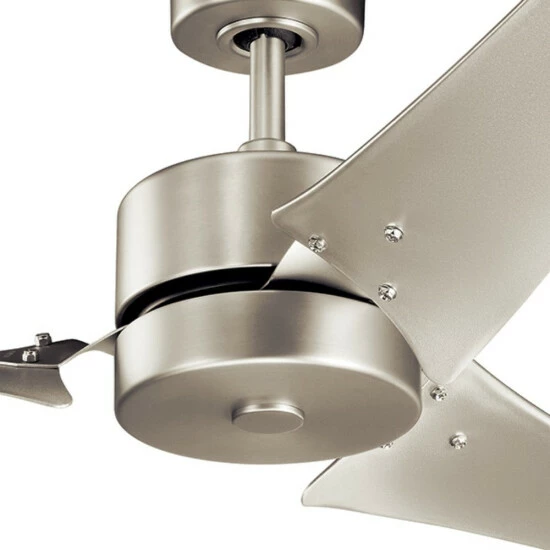 This 60-inch, 3 blade ceiling fan from the Motu collection features a brushed nickel finish that will subtly highlight the existing decor in your home. This attractive fan will complement many transitional decors. This brushed nickel ceiling fan from the Motu collection encompasses both contemporary and industrial looks. The 3 blades are pitched 35 degrees and come with a nickel finish. The 188MM X 25MM Motor will provide the quiet power you need. This fan comes complete with a 4 Speed Wall Slide Control System. Dimensions: 14.5 inches high x 60 inch diameter. Turn on our fixtures, and watch your room transform even more. From lighting to ceiling fans Kichler collections are built around our simple philosophy of bringing you the effect you want for your home or business. Our collections coordinate from room-to-room, or let you mix and match from wall-to-ceiling.