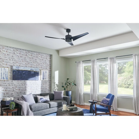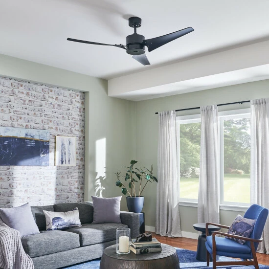 This 60-inch, 3 blade ceiling fan from the Motu collection features a satin black finish that will subtly highlight the existing decor in your home. This attractive fan will complement many transitional decors. This satin black ceiling fan from the Motu collection encompasses both contemporary and industrial looks. The 3 blades are pitched 35 degrees and come with a matching satin black finish. The 188MM X 25MM Motor will provide the quiet power you need. This fan comes complete with a 4 Speed Wall Slide Control System. Dimensions: 14.5 inches high x 60 inch diameter. Turn on our fixtures, and watch your room transform even more. From lighting to ceiling fans Kichler collections are built around our simple philosophy of bringing you the effect you want for your home or business. Our collections coordinate from room-to-room, or let you mix and match from wall-to-ceiling. And each fixture is designed to deliver a stunning quality of light that makes your space more beautiful and more livable. As one of the largest, privately held residential lighting fixture companies in North America, we’re constantly working to create innovative and on-trend decorative products as well as knowledgeable support. Since 1938, we’ve been creating products that are not only well designed, but also practical. We invest millions of dollars each year in design, technology and testing to assure that we’re offering distributors, designers, installers and homeowners not only innovative technologies – but also fixtures that perform efficiently, install intuitively and deliver a premium source of light. This philosophy holds true for everything we create – from our wide variety of decorative fixtures to our award-winning landscape lighting to our ceiling fans.