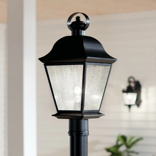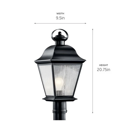 This 1-light outdoor post lantern from the Mount Vernon collection features a black finish that will complement many traditional decors. The clear seedy glass panels add interest and will create a warm welcoming glow to any outside decor. Dimensions: 20.75 inches high x 9.5 inch diameter. Turn on our fixtures, and watch your room transform even more. From lighting to ceiling fans Kichler collections are built around our simple philosophy of bringing you the effect you want for your home or business. Our collections coordinate from room-to-room, or let you mix and match from wall-to-ceiling. And each fixture is designed to deliver a stunning quality of light that makes your space more beautiful and more livable. As one of the largest, privately held residential lighting fixture companies in North America, we’re constantly working to create innovative and on-trend decorative products as well as knowledgeable support. Since 1938, we’ve been creating products that are not only well designed, but also practical. We invest millions of dollars each year in design, technology and testing to assure that we’re offering distributors, designers, installers and homeowners not only innovative technologies – but also fixtures that perform efficiently, install intuitively and deliver a premium source of light. This philosophy holds true for everything we create – from our wide variety of decorative fixtures to our award-winning landscape lighting to our ceiling fans.