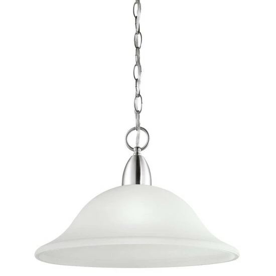 This Nicholson collection 1-light pendant features a chrome finish that will complement many transitional decors. The Satin etched glass shade softens the light creating an inviting atmosphere and completes this simple yet functional decor. This tasteful pendant from the Nicholson(TM) collection will make a refined statement in your home. Featuring an elegant, chrome finish and Satin Etched Glass detailing, this design will complement a range of spaces.