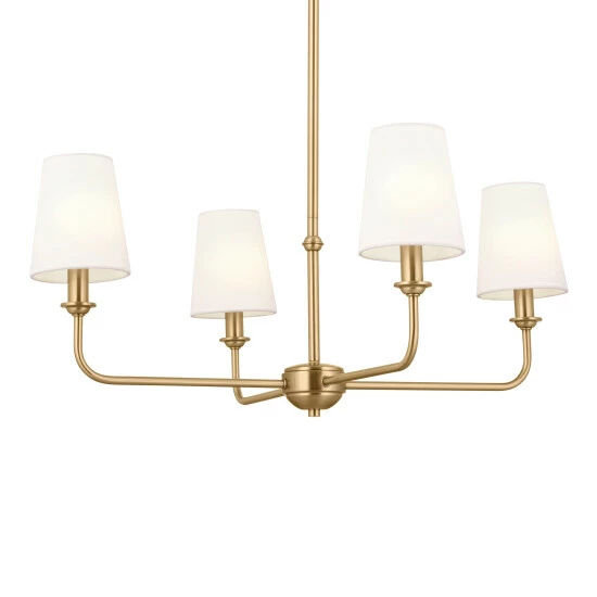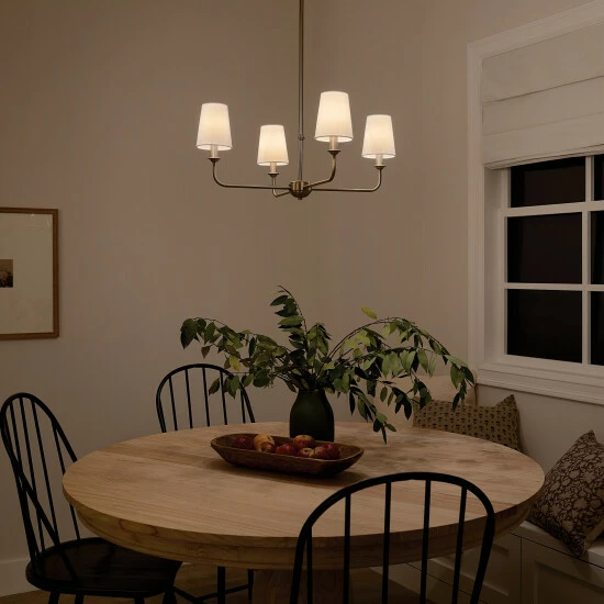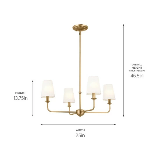 - What’s In the Box: (1) Canopy, (4) 6-inch Stems, (4) 12-inch Stems, (1) Fixture, (4) Fabric Shades, (4) Candle Sleeves, (1) 90-Degree Swivel, and (1) Mounting Hardware, Bulbs not included