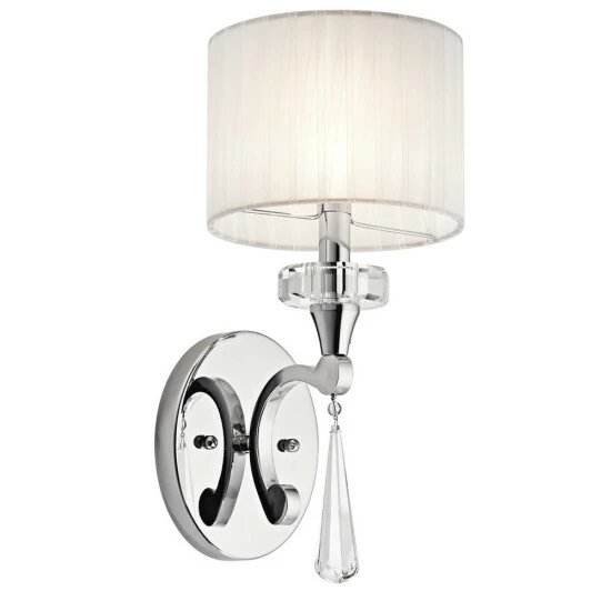 This 1-light wall sconce from the Parker Point collection features a chrome finish that will complement many contemporary and modern decors. The organza fabric shade softens the light and the optical crystal accents will add elegance to any space. Dimensions: 15.5 inches high x 6.75 inches wide x 8.5 inches deep. Turn on our fixtures, and watch your room transform even more. From lighting to ceiling fans Kichler collections are built around our simple philosophy of bringing you the effect you want for your home or business. Our collections coordinate from room-to-room, or let you mix and match from wall-to-ceiling. And each fixture is designed to deliver a stunning quality of light that makes your space more beautiful and more livable. As one of the largest, privately held residential lighting fixture companies in North America, we’re constantly working to create innovative and on-trend decorative products as well as knowledgeable support. Since 1938, we’ve been creating products that are not only well designed, but also practical. We invest millions of dollars each year in design, technology and testing to assure that we’re offering distributors, designers, installers and homeowners not only innovative technologies – but also fixtures that perform efficiently, install intuitively and deliver a premium source of light. This philosophy holds true for everything we create – from our wide variety of decorative fixtures to our award-winning landscape lighting to our ceiling fans.