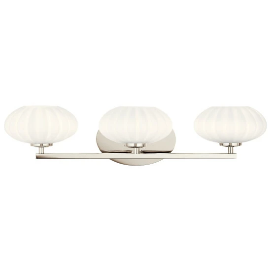 - 25″, three light vanity light with Polished Nickel finish and satin etched cased opal glass.