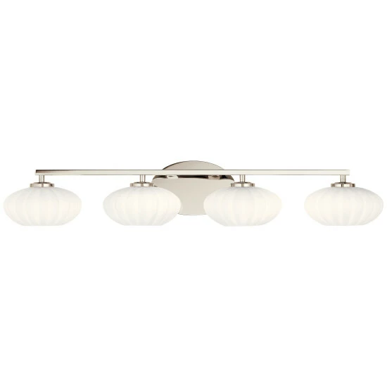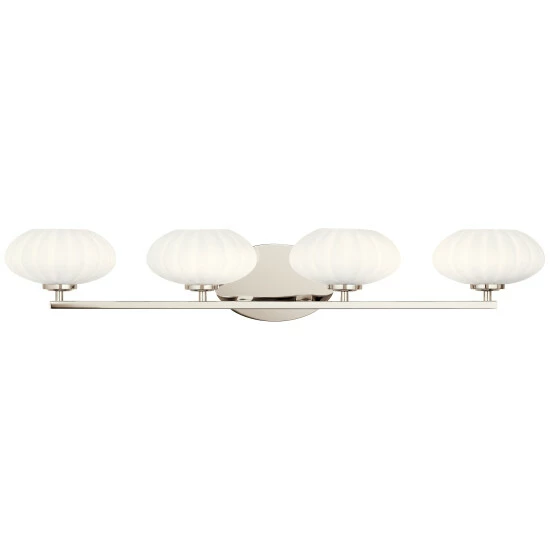- 34″, four light vanity light with Polished Nickel finish and satin etched cased opal glass.