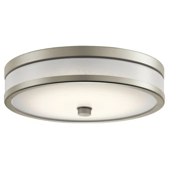 This Pira collection 1-light LED flush mount features a brushed nickel finish that will complement many utilitarian and transitional decors. The clean lines of the plastic frame adds interest while the acrylic applied tint with painted linen softens the light and completes this simple yet functional design.