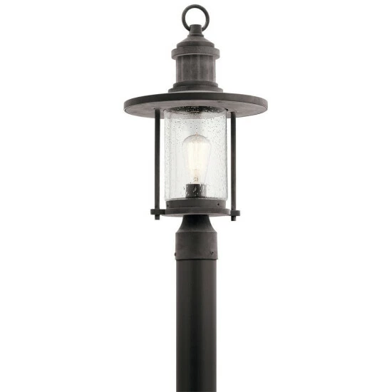 This Riverwood collection 1-light outdoor post mount features a weathered zinc finish that will complement many lodge, country, and rustic decors. Clean lines of the aluminum frame add interest while clear seeded glass gives your outdoor decor a whole new look. Riverwood’s modern take on this vintage-style outdoor post lantern gives outdoor spaces a rustic seaside vibe. Bringing together touches of nautical style and industrial charm. Post is not included. Dimensions: 19.75 inches high x 11 inch diameter. Turn on our fixtures, and watch your room transform even more. From lighting to ceiling fans Kichler collections are built around our simple philosophy of bringing you the effect you want for your home or business. Our collections coordinate from room-to-room, or let you mix and match from wall-to-ceiling. And each fixture is designed to deliver a stunning quality of light that makes your space more beautiful and more livable. As one of the largest, privately held residential lighting fixture companies in North America, we’re constantly working to create innovative and on-trend decorative products as well as knowledgeable support. Since 1938, we’ve been creating products that are not only well designed, but also practical. We invest millions of dollars each year in design, technology and testing to assure that we’re offering distributors, designers, installers and homeowners not only innovative technologies – but also fixtures that perform efficiently, install intuitively and deliver a premium source of light. This philosophy holds true for everything we create – from our wide variety of decorative fixtures to our award-winning landscape lighting to our ceiling fans.