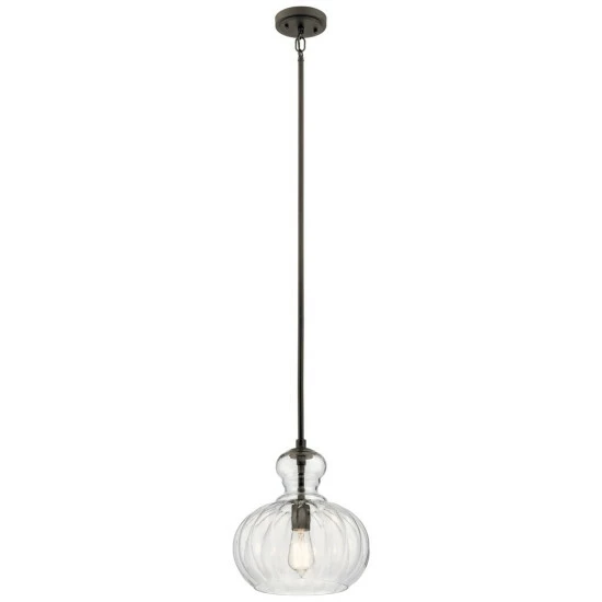 This Riviera collection 1-light pendant features an olde bronze finish that will complement many transitional decors. The clear ribbed blown glass shade adds interest while completing this simple yet functional decor. Inspired by antique, vintage perfume bottles, this Riviera pendant in olde bronze is the perfect touch of retro design. Use alone or in clusters to make a decorative statement. The clear fluted glass removes easily for cleaning. This piece includes 36 inches of stems and 66 inches of wire so it can be hung at your desired height (Up to 51 inches). Dimensions: 13 inches high x 11.5 inch diameter.