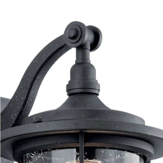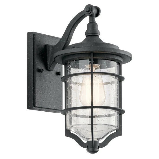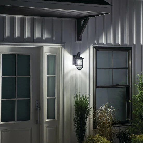 This Royal Marine collection 1-light outdoor wall lantern features a distressed black finish that will complement many transitional decors. The aluminum cage surrounding the clear seeded glass adds interest and gives your outdoor decor a whole new look. The Royal Marine collection’s nautical-inspired style gets a 21st-century update with a slightly scalloped base and decorative arm. The oversized caged glass features a seeded detailing, adding to the vintage character. Dimensions: 13.25 inches high x 7 inches wide x 9.25 inches deep. Turn on our fixtures, and watch your room transform even more. From lighting to ceiling fans Kichler collections are built around our simple philosophy of bringing you the effect you want for your home or business. Our collections coordinate from room-to-room, or let you mix and match from wall-to-ceiling. And each fixture is designed to deliver a stunning quality of light that makes your space more beautiful and more livable. As one of the largest, privately held residential lighting fixture companies in North America, we’re constantly working to create innovative and on-trend decorative products as well as knowledgeable support. Since 1938, we’ve been creating products that are not only well designed, but also practical. We invest millions of dollars each year in design, technology and testing to assure that we’re offering distributors, designers, installers and homeowners not only innovative technologies – but also fixtures that perform efficiently, install intuitively and deliver a premium source of light. This philosophy holds true for everything we create – from our wide variety of decorative fixtures to our award-winning landscape lighting to our ceiling fans.