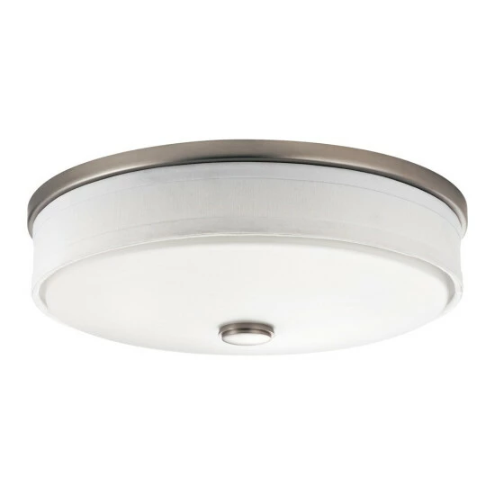 This Santiago collection 1-light LED flush mount features a brushed nickel finish that will complement many transitional decors. The clean lines of the steel frame add interest while the white linen shade and acrylic diffuser softens the light. With simple curves and pleasing clarity, this LED flush mount from the Santiago collection is ideal for any bathroom or vanity space. Calm and energy efficient, this design uses a white linen fabric shade and a matte white acrylic diffuser to create widespread uniform light. Featuring a playful brushed nickel finished ribbon trim, you can effortlessly incorporate this adaptable design into your existing decor. The 1500 delivered Lumens is equivalent to around a 100 W Incandescent bulb. Dimensions: 4.25 inches high x 13 inch diameter. Turn on our fixtures, and watch your room transform even more. From lighting to ceiling fans Kichler collections are built around our simple philosophy of bringing you the effect you want for your home or business. Our collections coordinate from room-to-room, or let you mix and match from wall-to-ceiling. And each fixture is designed to deliver a stunning quality of light that makes your space more beautiful and more livable. As one of the largest, privately held residential lighting fixture companies in North America, we’re constantly working to create innovative and on-trend decorative products as well as knowledgeable support. Since 1938, we’ve been creating products that are not only well designed, but also practical. We invest millions of dollars each year in design, technology and testing to assure that we’re offering distributors, designers, installers and homeowners not only innovative technologies – but also fixtures that perform efficiently, install intuitively and deliver a premium source of light. This philosophy holds true for everything we create – from our wide variety of decorative fixtures to our award-winning landscape lighting to our ceiling fans.