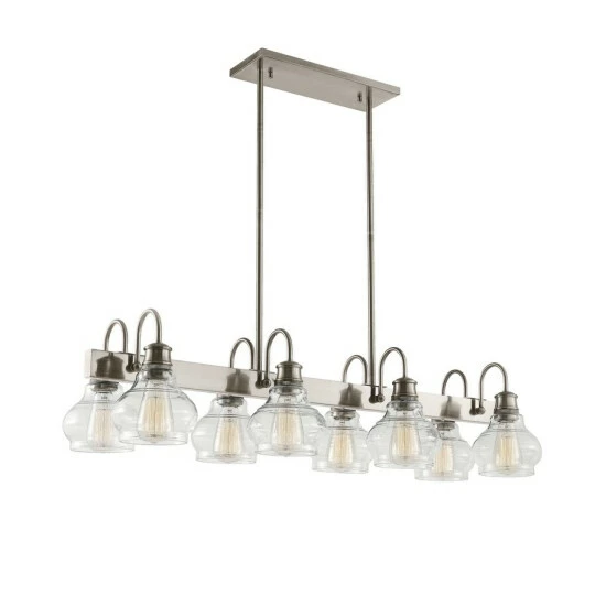 This Schoolhouse collection 8-light linear chandelier features a classic pewter finish that will complement many traditional decors. The clean lines of the steel frame adds interest while the clear glass shades provide uninterrupted light to any island space. Vintage schoolhouse-era inspired glass globes pair with slim decorative arms to add charm and character over dining spaces, kitchen islands or game spaces. Enhance the look with antique-style bulbs for a truly rustic take on a classic silhouette.