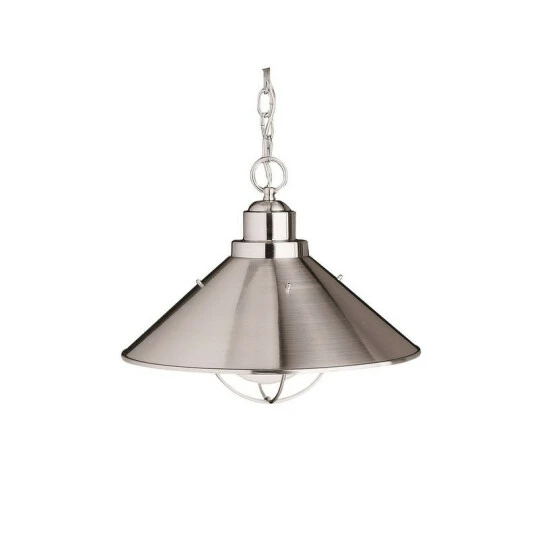 This Seaside collection 1-light outdoor pendant features a brushed nickel finish that will complement many lodge, country, and rustic decors. The matching metal shade adds interest and completes this simple yet functional design. Its features include an aluminum and stainless steel construction, Brushed Nickel finish, and is U.L. listed for damp locations.