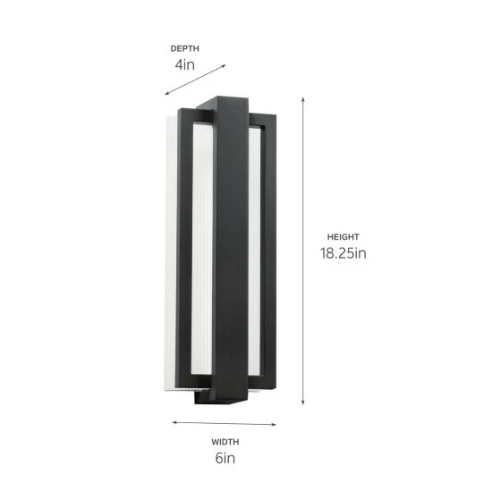 This Sedo collection 1-light outdoor LED wall sconce features a satin black finish that will complement many contemporary and modern decors. Interlocking rectangles making up the frame add interest while the ribbed glass shade gives a unique look to the light. This vertical outdoor LED wall sconce, in Satin Black, brings a sleek and contemporary style to your home or business. The 800 delivered Lumens is equivalent to around a 60 W incandescent bulb. Dimensions: 18.25 inches high x 6 inches wide x 4 inches deep. Turn on our fixtures, and watch your room transform even more. From lighting to ceiling fans Kichler collections are built around our simple philosophy of bringing you the effect you want for your home or business. Our collections coordinate from room-to-room, or let you mix and match from wall-to-ceiling. And each fixture is designed to deliver a stunning quality of light that makes your space more beautiful and more livable. As one of the largest, privately held residential lighting fixture companies in North America, we’re constantly working to create innovative and on-trend decorative products as well as knowledgeable support. Since 1938, we’ve been creating products that are not only well designed, but also practical. We invest millions of dollars each year in design, technology and testing to assure that we’re offering distributors, designers, installers and homeowners not only innovative technologies – but also fixtures that perform efficiently, install intuitively and deliver a premium source of light. This philosophy holds true for everything we create – from our wide variety of decorative fixtures to our award-winning landscape lighting to our ceiling fans.