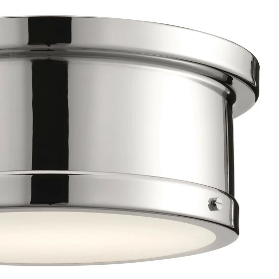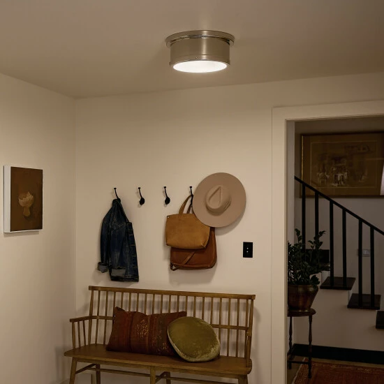 Simple yet strong, that’s the design of the Serca collection. Featuring a classic shape with elegantly refined details, Serca elevates your lighting and keeps it there. Upgrading the classic drum shape, Serca’s design was inspired by crown moulding from the Biltmore House. Finished in a refined polished nickel, this 14 inch flush mount’s sleek metal frame is subtle yet impactful. Small knobs around the bottom of the fixture’s frame allow for easy cleaning and bulb replacement.