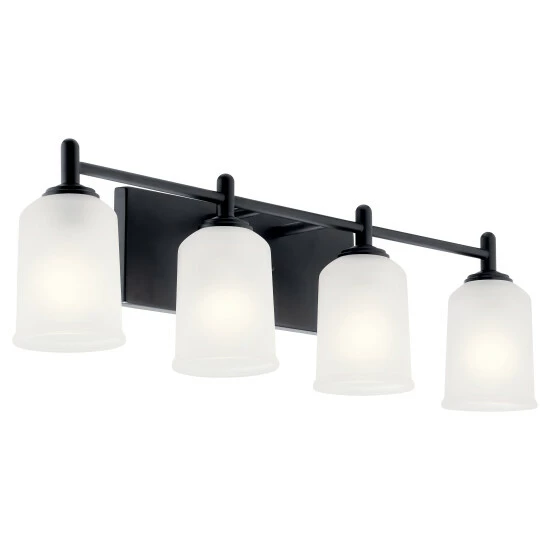 The Shailene 29.75 inch 4 light vanity light features a classic look with its clean lines in Black finish and satin etched glass. The Shailene vanity light works in several aesthetic environments, including traditional and transitional. It’s a beautiful light source in your living space and like a foundation or a canvas upon which to paint a distinctive lighting picture.