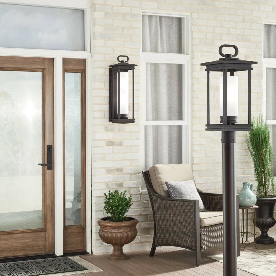 This South Hope collection 1-light outdoor post mount features a rubbed bronze finish that will complement many transitional decors. The satin etched cased opal glass cylinder shade creates a warm welcoming glow to your outdoor decor. This mounted post from the South Hope(TM) collection softens its sturdy rectangular design with satin etched cased opal glass for an expertly understated grace and welcoming light. Open and clean, this design can complement any porch or walkway.