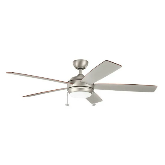 This 60-inch, 5 blade ceiling fan from the Starkk collection features a brushed nickel finish that will subtly highlight the existing decor in your home. This attractive fan will complement many transitional decors. The 5 blades are pitched 14 degrees and are reversible with your choice of a silver or walnut finish. The 188mm x 25mm Motor will provide the quiet power you need. This fan comes complete with a pull chain (3 speeds forward and reverse). Dimensions: 14.22 inches high x 60 inch diameter. Turn on our fixtures, and watch your room transform even more. From lighting to ceiling fans Kichler collections are built around our simple philosophy of bringing you the effect you want for your home or business. Our collections coordinate from room-to-room, or let you mix and match from wall-to-ceiling. And each fixture is designed to deliver a stunning quality of light that makes your space more beautiful and more livable. As one of the largest, privately held residential lighting fixture companies in North America, we’re constantly working to create innovative and on-trend decorative products as well as knowledgeable support. Since 1938, we’ve been creating products that are not only well designed, but also practical. We invest millions of dollars each year in design, technology and testing to assure that we’re offering distributors, designers, installers and homeowners not only innovative technologies – but also fixtures that perform efficiently, install intuitively and deliver a premium source of light. This philosophy holds true for everything we create – from our wide variety of decorative fixtures to our award-winning landscape lighting to our ceiling fans.