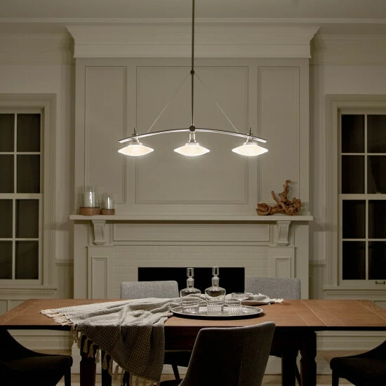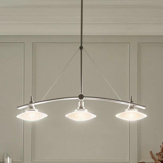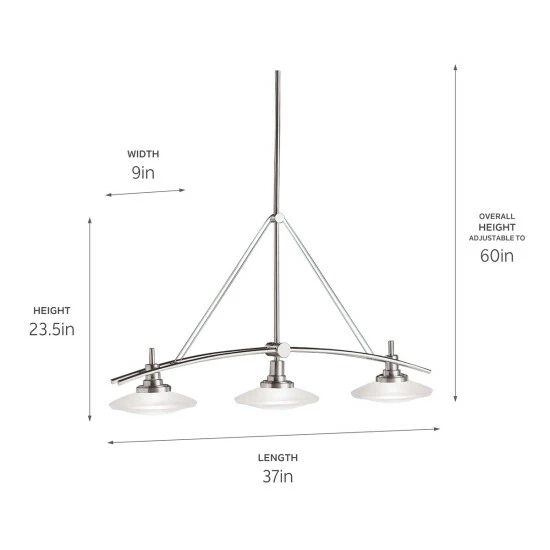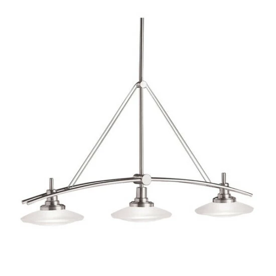 This Structures collection 3-light halogen linear chandelier features a brushed nickel finish that will complement many contemporary and modern decors. The smooth lines of the frame add interest while satin etched glass shades soften the light. The Structures collection proves that one style can take on numerous forms. The Structures motif, along with our brushed nickel finish and satin-etched glass, gives a timeless, clean feel to the fixtures, capable of matching any decor. For a modern spin on the classic island light, the Structures collection recommends this outstanding fixture whose clean, simple lines will highlight any motif. This piece includes 36 inches of stems and 92 inches of wire so it can be hung at your desired height (up to 60 inches). Dimensions: 21.5 inches high x 37 inches wide x 9 inches deep. Turn on our fixtures, and watch your room transform even more. From lighting to ceiling fans Kichler collections are built around our simple philosophy of bringing you the effect you want for your home or business. Our collections coordinate from room-to-room, or let you mix and match from wall-to-ceiling. And each fixture is designed to deliver a stunning quality of light that makes your space more beautiful and more livable. As one of the largest, privately held residential lighting fixture companies in North America, we’re constantly working to create innovative and on-trend decorative products as well as knowledgeable support. Since 1938, we’ve been creating products that are not only well designed, but also practical. We invest millions of dollars each year in design, technology and testing to assure that we’re offering distributors, designers, installers and homeowners not only innovative technologies – but also fixtures that perform efficiently, install intuitively and deliver a premium source of light. This philosophy holds true for everything we create – from our wide variety of decorative fixtures to our award-winning landscape lighting to our ceiling fans.