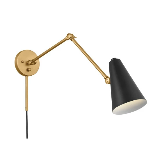 The Sylvia 1 light wall sconce makes a big impression in a soft voice. The shade is Black on the outside (White on the inside,) has an on/off switch, and can swivel to direct light where you want. Straight arms extend in a Natural Brass finish, giving the entire fixture a luxurious feel.